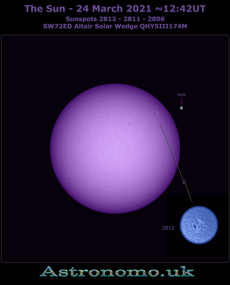 The Sun – 24 March 2021 ~12:42UT Sunspots 2812 – 2811 – 2806 SW72ED Altair Solar Wedge QHY5III174M