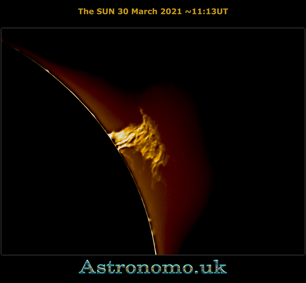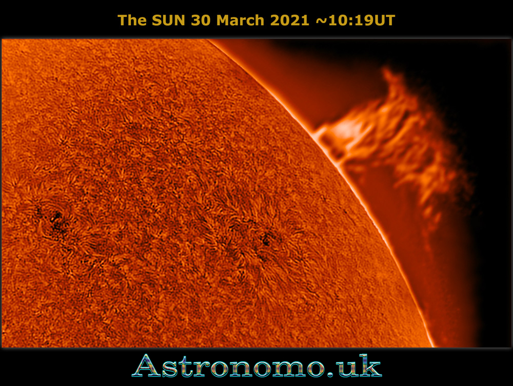 The Sun on a very windy day 13 Mar 2019 – 13:45UT This is 45m later and small bottom left prominence disappeared