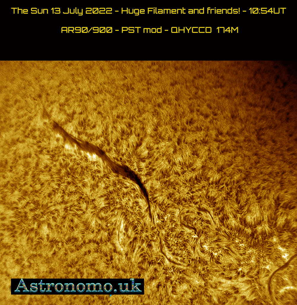 The Sun 13 July 2022 – Huge Filament and friends! – 10:54UT – Re-processed to show more what is going on within the blackness of the filament… AR90/900 – PST mod – QHYCCD 174M