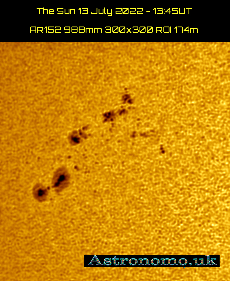 The Sun 13 July 2022 – 13:45UT AR152 988mm 300×300 ROI 174m