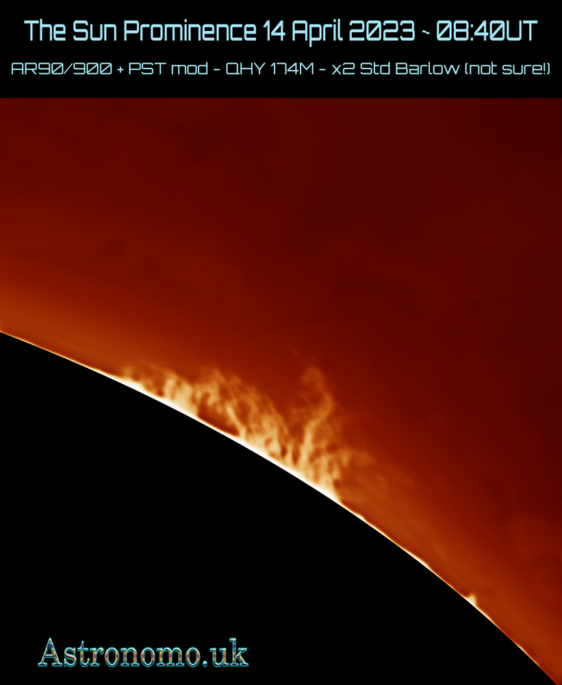 The Sun – 11 April 2023 – 3 prominences ~10:28 UT EQ6 – Pro (Old one) + AR90/900 + PST mod + QHY 174M mini – testing after fixing various problems… i.e. EQ cable re-soldering (!), USB3 Extension misbehaving, Tested setup after inserting a 25mm extension to the train. Next time will have to fix more!